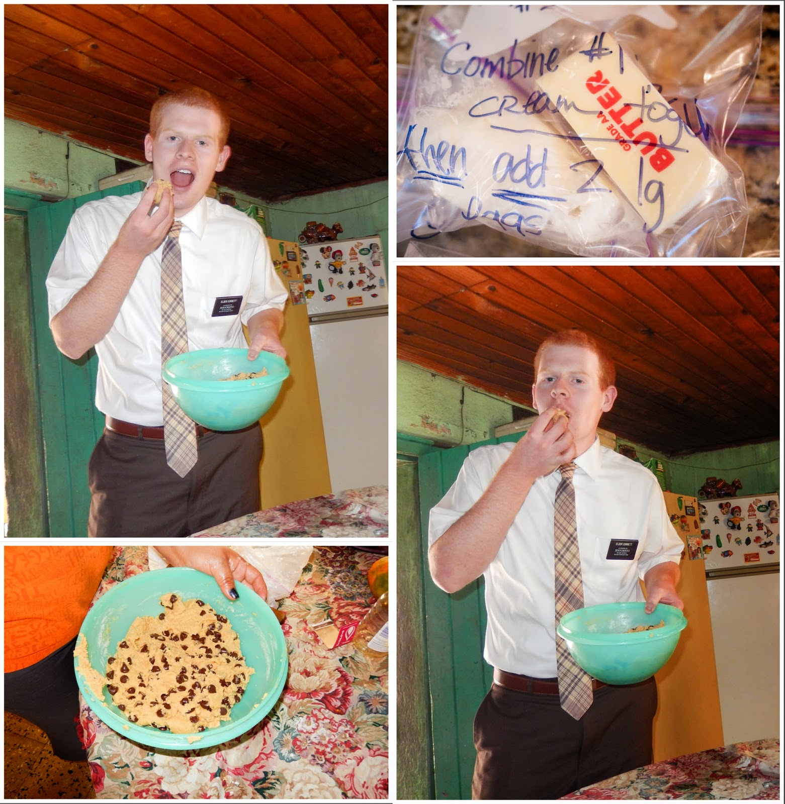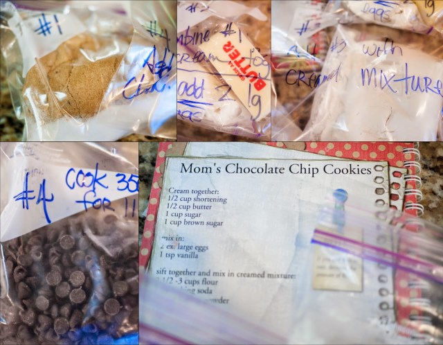 I have been googling the best way to keep cookies fresh when sending through the mail and also, what cookies stay fresh the longest…well, there was no good answers. Mostly, the articles talked about how to keep them from breaking…well that wasn’t even a concern yet, which just added to my frustration. Then it came to me, he can bake them there, I just need to send him the ingredients!!!! So that is what I have done. Step #1 cream the pre-measured brown sugar and white sugar with the butter and shortening (btw, I measured the vanilla and stuck it in the middle of the brown sugar). Once creamed, add 2 eggs (you must find your own eggs). #3 add dry ingredients, bag 3 mix well. Add bag #4 and then BAKE 350 degrees for 11-12 minutes. I hope they taste like home!!! I can’t wait to hear how they turned out!!